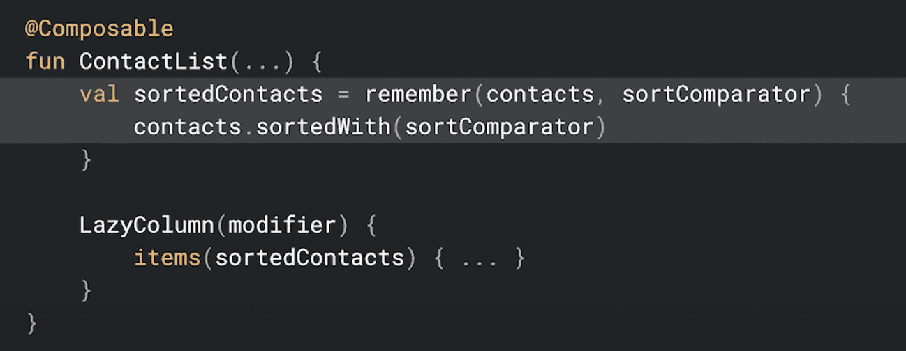 rememberに連絡先リストとsortComparatorをセットすることで、いずれかが変更されるたびにリストが再分類されますが、Re-Composeのたびに再構築されるわけではありません。 -