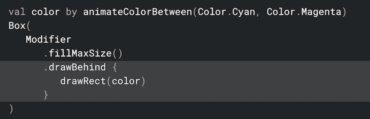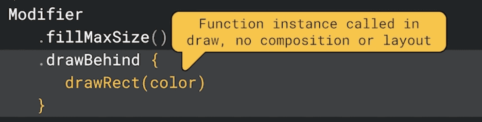 backgroundの代わりにdrawBehindを使用します。drawBehindは、 Compose の draw フェーズ中に呼びだされる関数インスタンスを取ります。色の値が読み取られるのはこの時だけなので、色が変わったときに変更する必要があるのは draw フェーズの結果だけです。 - その後、 draw フェーズが再実行必要な唯一のフェーズになり、 Compose が Composition と Layout の両方をスキップできるようになります。