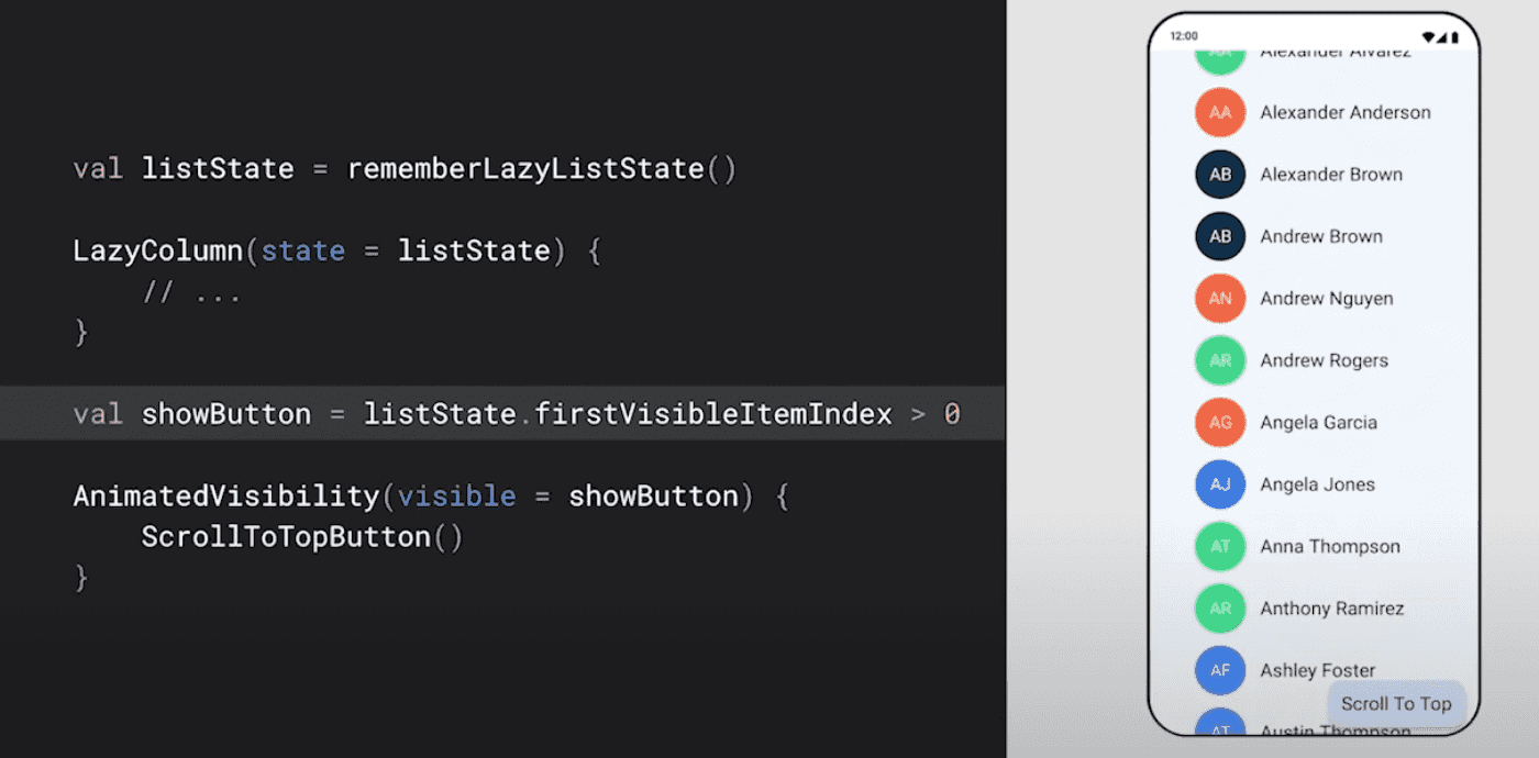 firstVisibleItemIndexが 0 より大きい場合にtrueになるshowButtonという Boolean 変数を追加できます。これをAnimatedVisibilityのパラメーターとして使用できます。 -