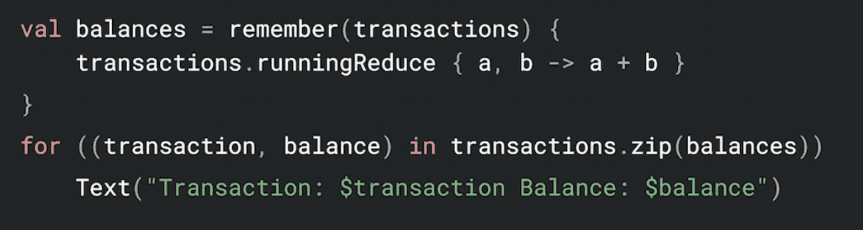 rememberを使用し、 State への書き込みを完全に回避する、より良いバージョンのコードです。このバージョンでは、Composable関数が最初に表示されたときに1回だけ実行されます。また、トランザクションが変更された場合のみ古くなったと見なされます。 - これの更に優れたバージョンは、前の並び替えの例のように ViewModel で