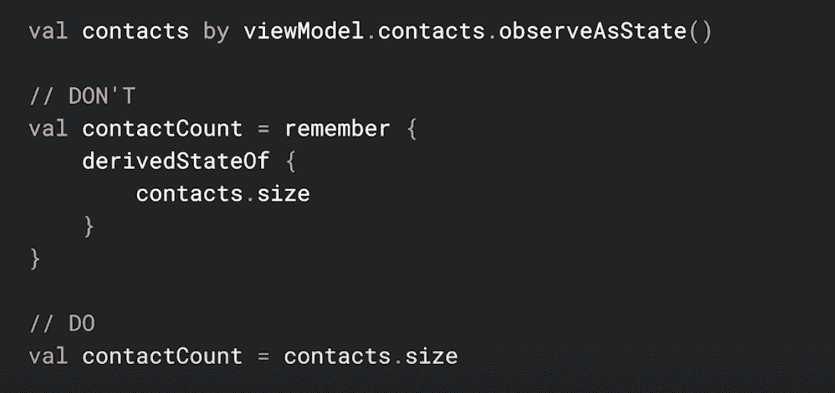 derivedStateOfに適していないかを覚えておくことが重要です。ある State から変数を作成するたびにderivedStateOfを使用する必要はありません。