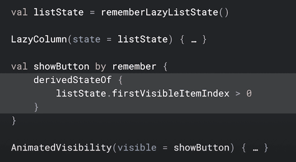 firstVisibleItemIndex > 0をderivedStateOfでラップします。この条件が実際に変更されたときのみ Re-Compose します。つまり、リストを下にスクロールしたときに1回、リストを上にスクロールしたときにもう一度 Re-Compose します。 - 状態を Bool 値に変換する時はいつでも