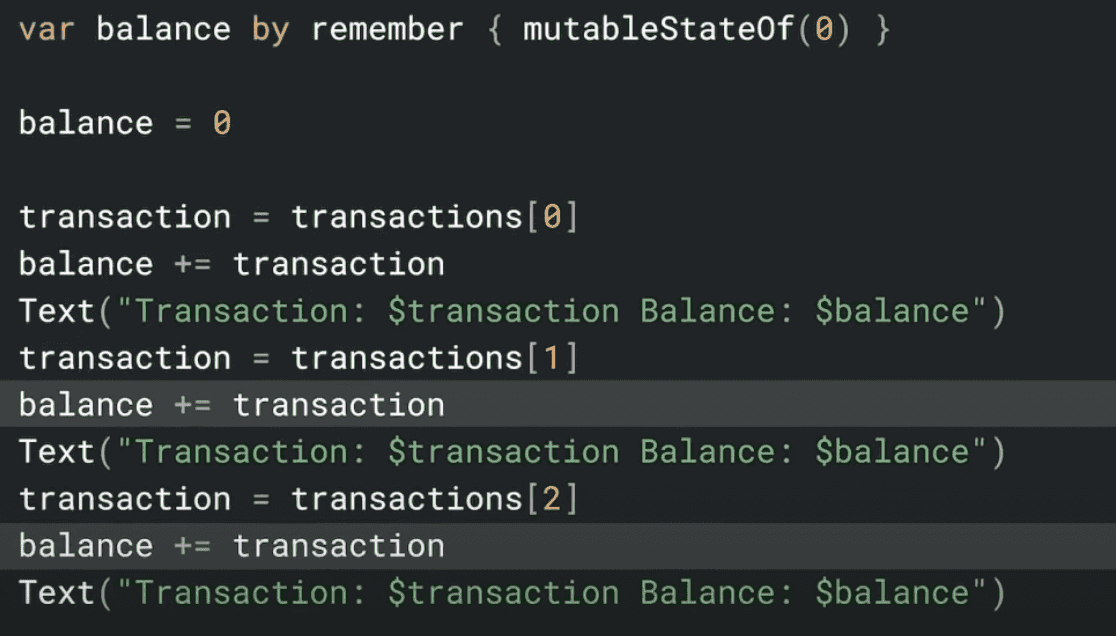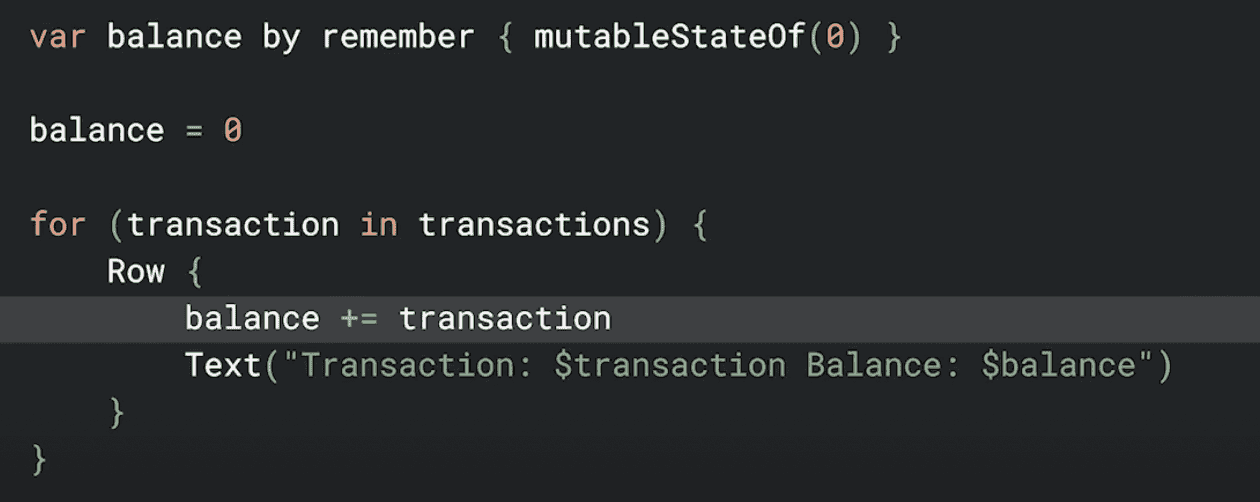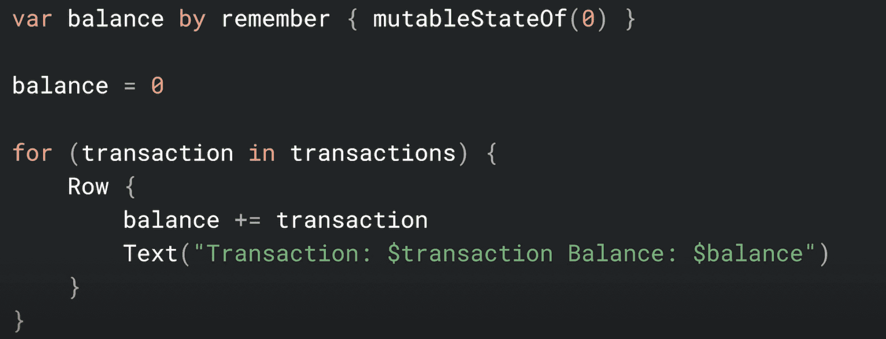 balanceを更新するための行であることに気づきました。このコードは、 Compose の重要な前提に反しています。 - Compose は値が読み取られると、Composition が完了するまで変更されないことを前提としています。Composition ですでに読み取られている値には絶対に書き込まないでください。