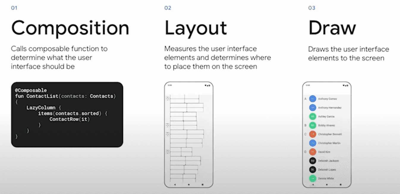 - Compose には、 Composition, Layout, Draw の3つの主要なフェーズがあります。